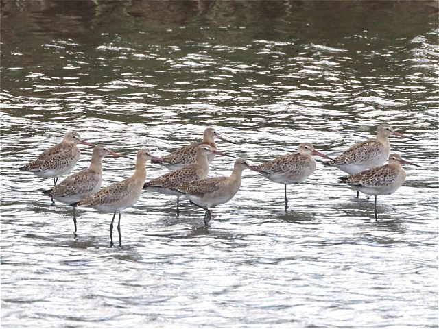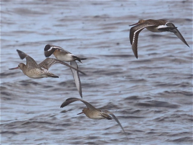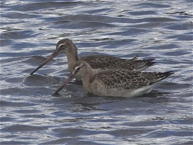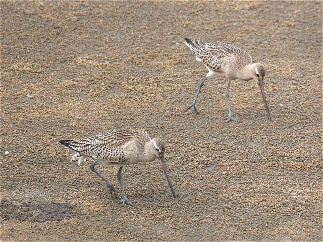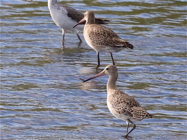 | (右写真)羽に白い部分がある右上側2羽がオグロシギ 左下側2羽がオオソリハシシギ ![]() |